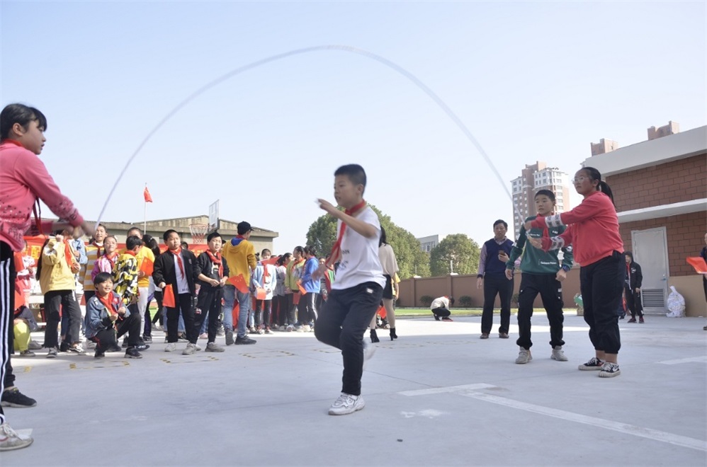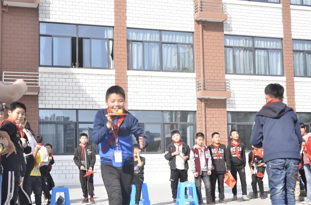 操場上人潮涌動、紅旗飄揚。活動的第二個環節是趣味游戲。共有“急速60秒”、“長龍擺尾繞櫈子”、“八字穿花跳長繩”、“乒乓運球接力賽”四個項目。一到操場上,孩子們安奈不住激動的心情,躍躍欲試。但即使再心癢,還是在老師的口令下,列隊、報數、分組,井然有序、整裝待發。